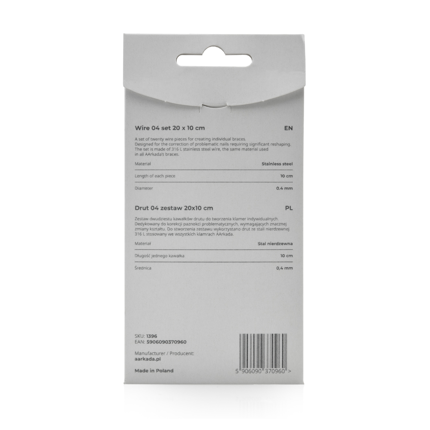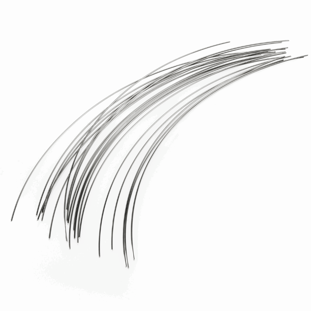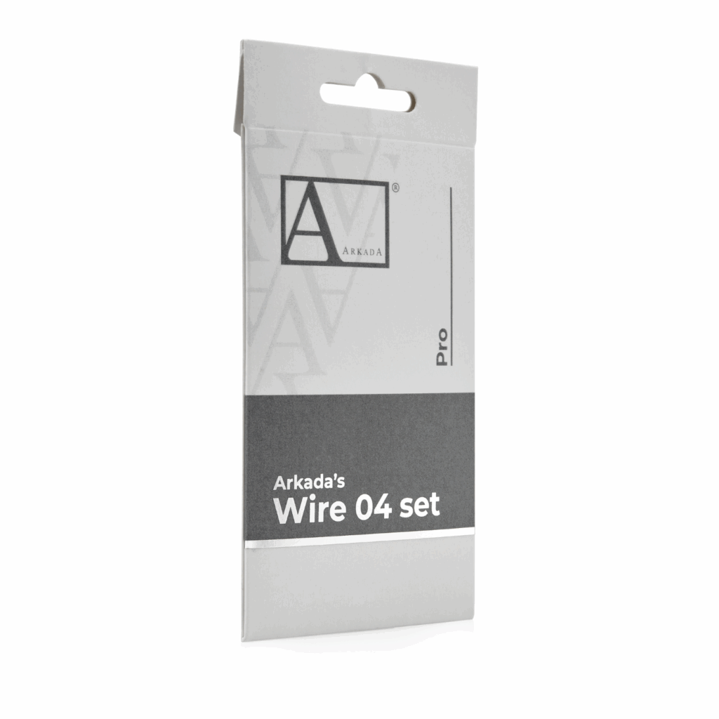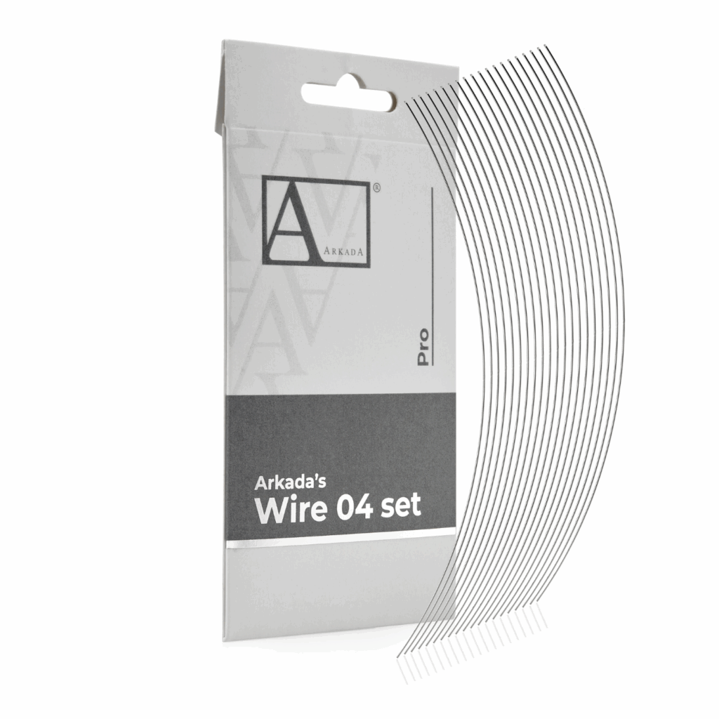 Zestaw dwudziestu kawałków drutu do tworzenia klamer indywidualnych. Dedykowany do korekcji paznokci problematycznych, wymagających znacznej zmiany kształtu. DO stworzenia zestawu wykorzystano drut ze stali nierdzewnej 316 L stosowany we wszystkich klamrach AArkada.