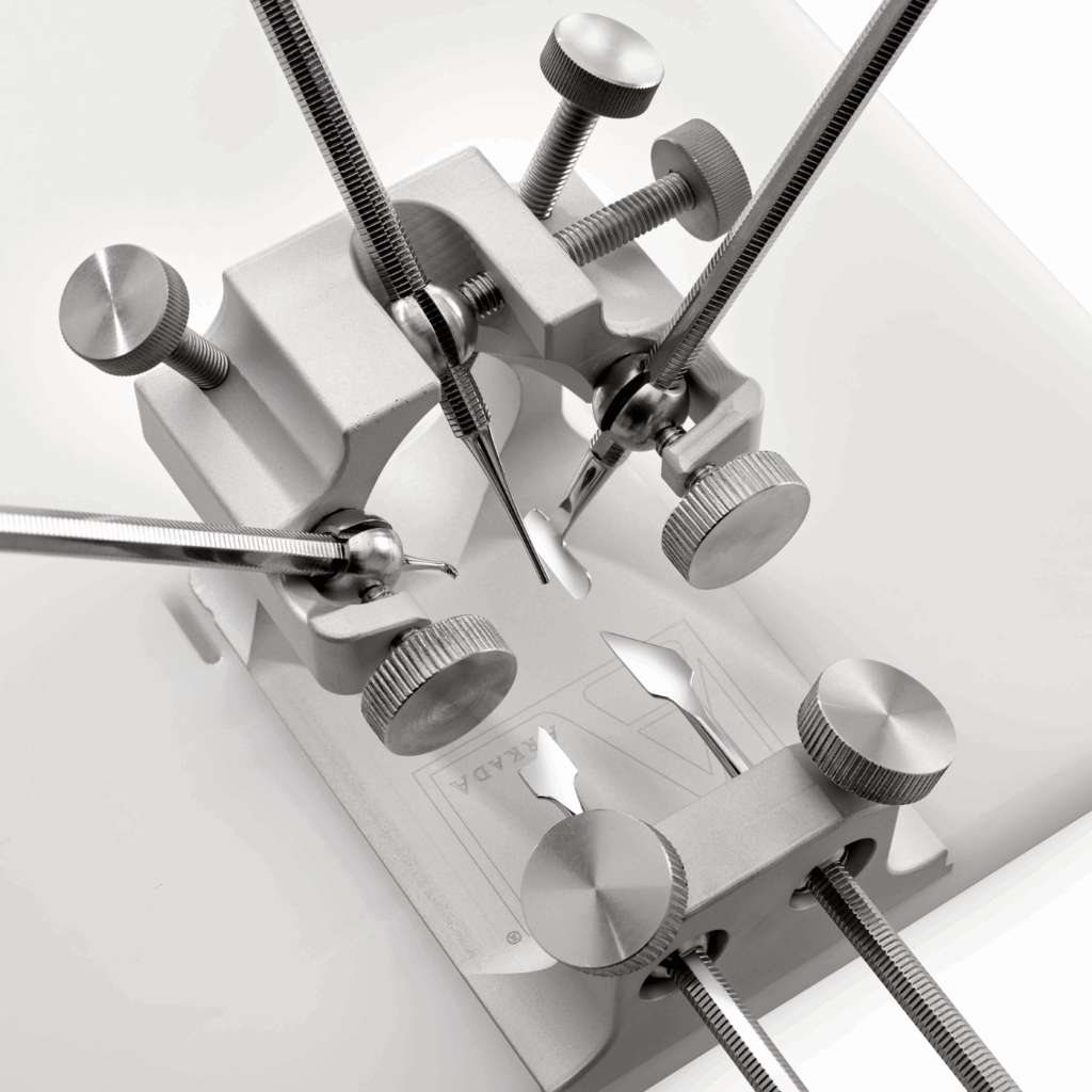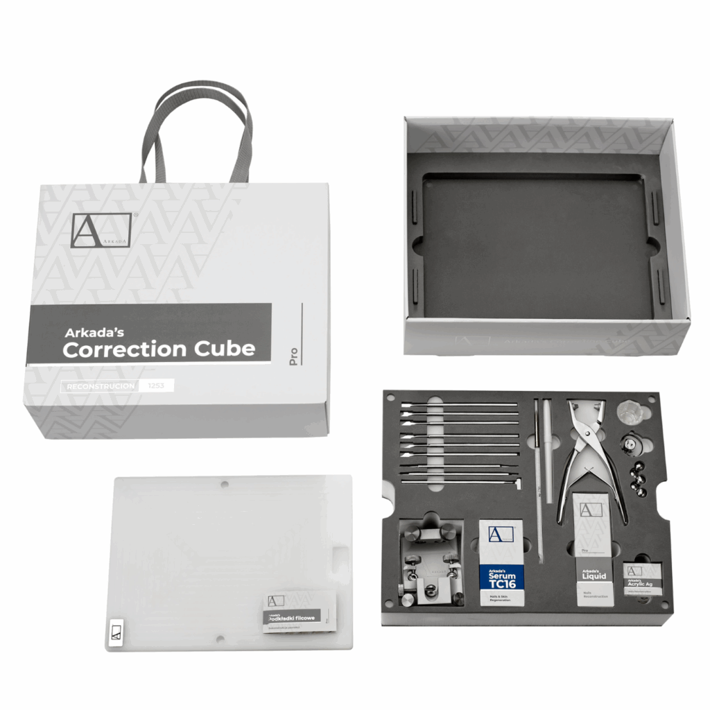 Kostka Arkady umożliwia ustabilizowanie stopy, palca i płytki paznokcia. Przy użyciu manipulatorów z łatwością można odblokować wrastające fragmenty paznokcia i wykonać protezę płytki z żywicy akrylowej.
